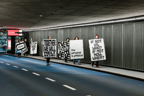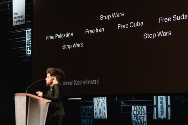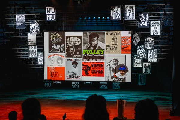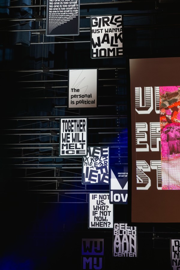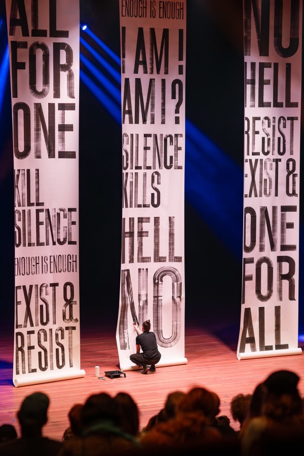 “All for one, kill silence, enough is enough, I am! Am I?” Three large rolls of paper descended from the ceiling, each covered in handwritten messages, stretching vertically across the space. Live on stage, De Boer completed the central banner with the words “Hell no.” It was a striking and confrontational start—one that from the outset framed typography not as decoration, but as protest, as voice, as action. When the banners were lifted, a new landscape of black-and-white posters bearing bold statements such as “If not us, who? If not now, when?” was revealed.