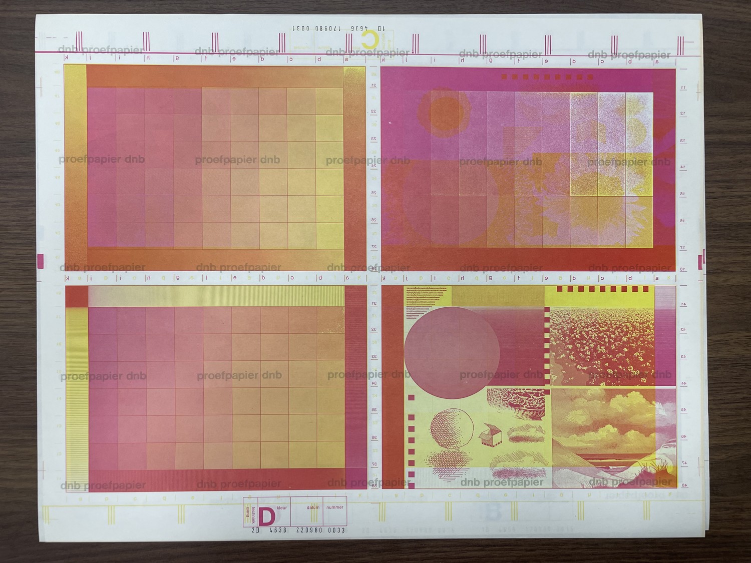 R.D.E. Oxenaar. Kleurproeven vijftigguldenbiljet – 1, 17-09-1980 tot 22-09-1980. Proefdruk op papier. Archief van Ootje Oxenaar, Allard Pierson, Amsterdam UBA681.198. Foto: Cilia Schoonhoven, Amsterdam.